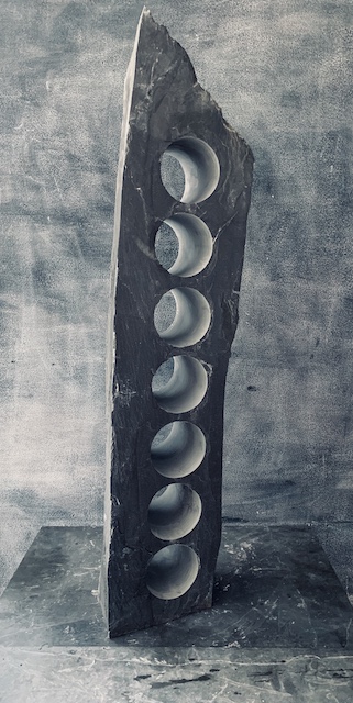 Lean slate wine rack core drilled from world famous Welsh Slate. This is one of my most popular designs where the holes are drilled in a linear vertical fashion. Predominanlty grey in colour with a slight curve on the side.